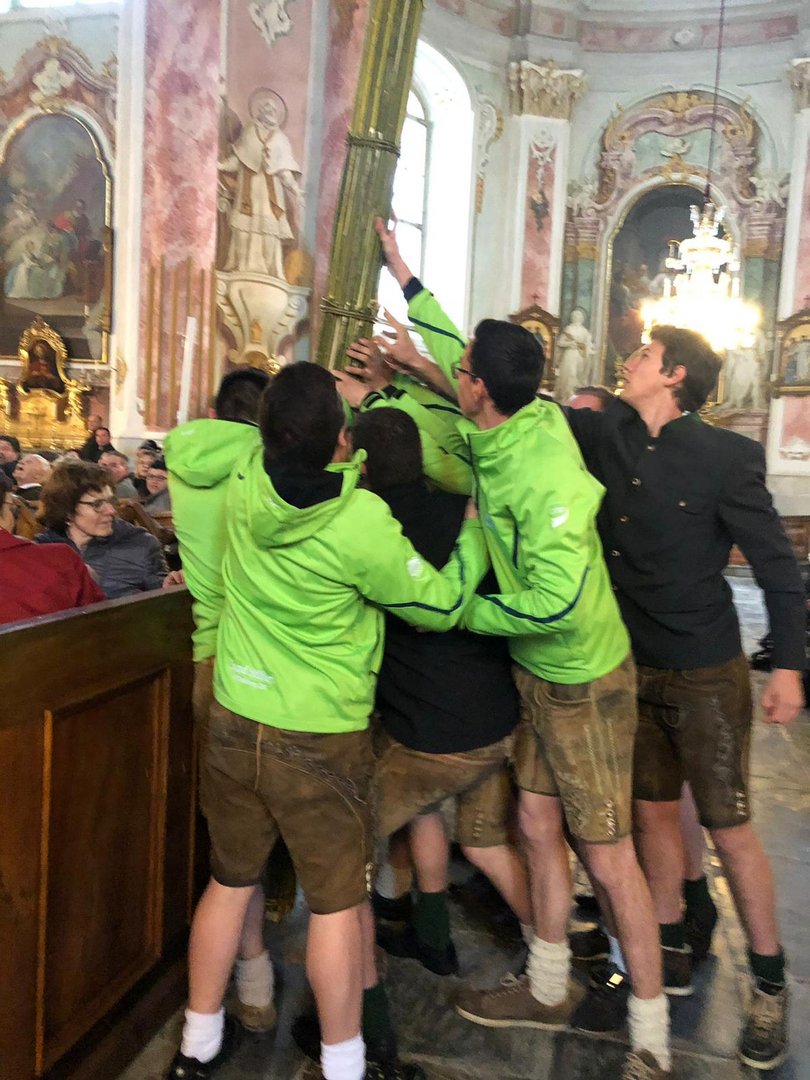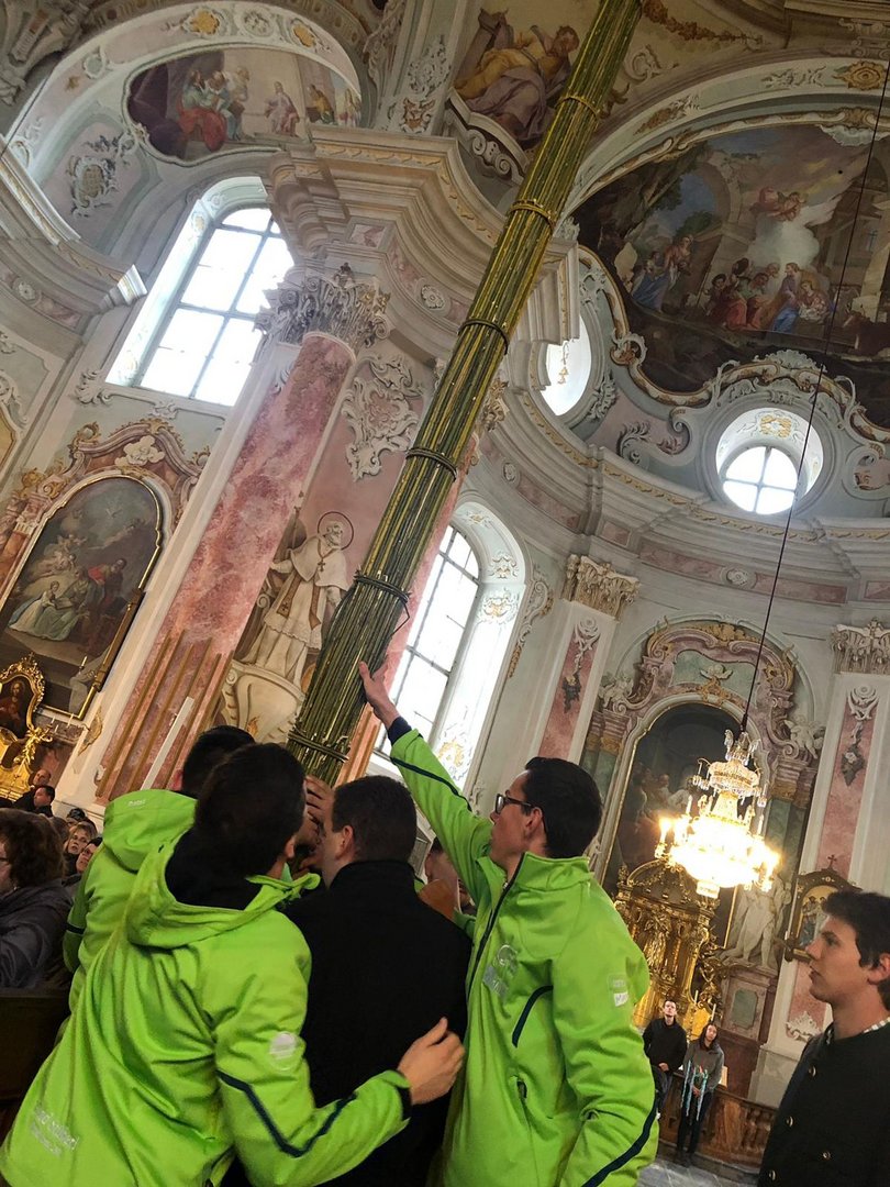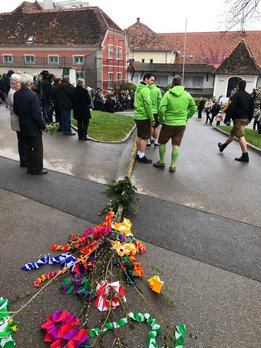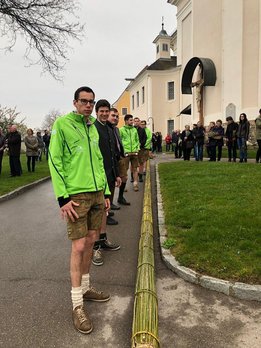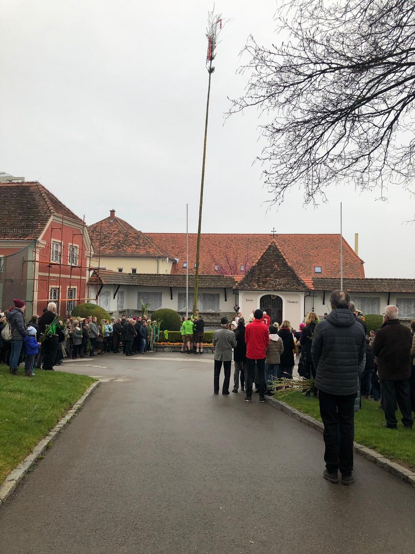 Am Palmsonntag machten sich unsere Burschen früh morgens auf den Weg unseren Riesenpalmbuschen von Sonnleiten, wo wir ihn gebunden haben, zur Basilika Kirche am Weizberg zu tragen. Natürlich kamen sie pünktlich an und konnten den Palmbuschen ohne Probleme aufstellen.